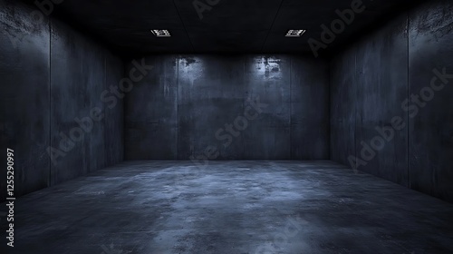 Dark room, concrete walls, subtle lighting, empty space, industrial backdrop