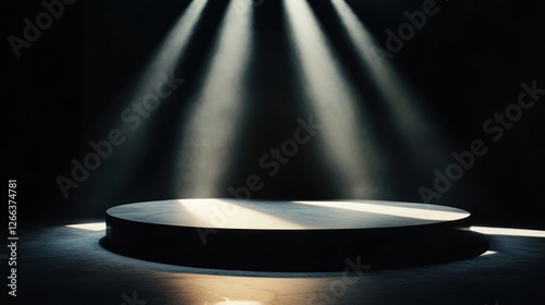 Dark room with spotlight illuminating a circular platform.