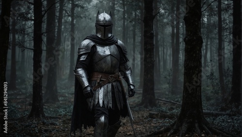 Dark, scary, mysterious knight wearing armor, in the dark, wicked forest