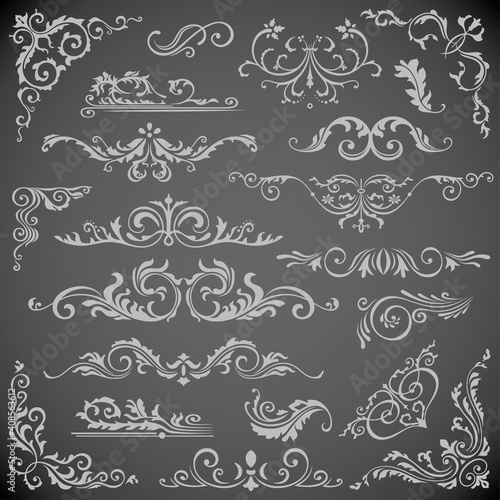 Dark set of Swirl Elements for Frame Design. Calligraphic page decoration, Labels, banners, antique and baroque Frames floral ornaments. Wedding