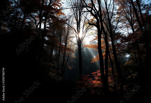 Dark, shadowy autumn forest; sunlight barely penetrates dense canopy, spooky, landscape