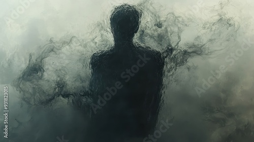 Dark silhouette of a person enveloped in swirling smoke, creating an eerie and mysterious atmosphere in a blurred, cloudy background.