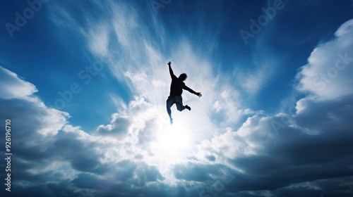 Dark silhouette of an individual leaping upward with a clear blue sky and fluffy white clouds