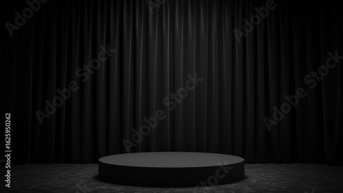 Dark, smoky background with a black podium, creating a dramatic and abstract stage for product displays.