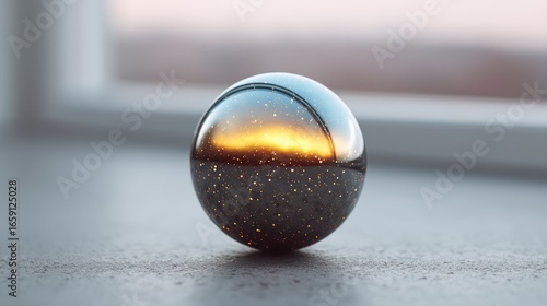 Dark sphere with golden flecks reflecting a bright cloudy sky black glitter