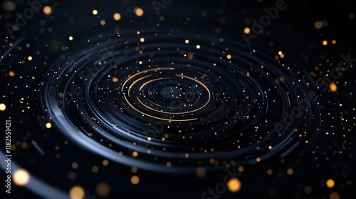 Dark spiral pattern with glowing golden particles in a circular formation. abstract technology representation.