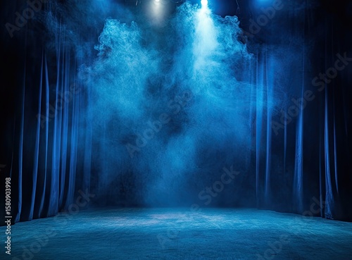 Dark stage with blue spotlights and smoky atmosphere.