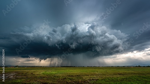 Dark storm clouds loom ominously over a vibrant green field in the early evening light. Rain begins to fall, creating a striking contrast against the stormy sky.