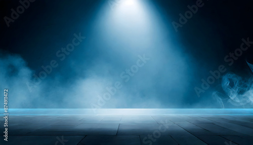 Dark street, asphalt abstract dark blue background, empty dark scene, neon light, spotlights. Generative AI.