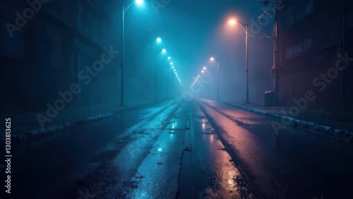 Dark street, wet asphalt, reflections of rays in the water. Abstract dark blue background, smoke, smog. Empty dark scene, neon light, spotlights