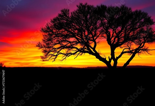 Dark tree silhouette against vibrant sunset sky, sun, shadows