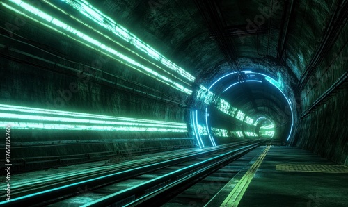 dark tunnel with neon lights. Light streaks of blue and green light the way ahead. In front, there is an empty train track. The scene has a minimalistic feel to it.