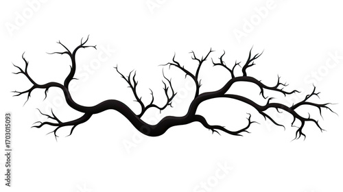 Dark twisted tree branch with multiple bare branches silhouette nature element isolated on white background