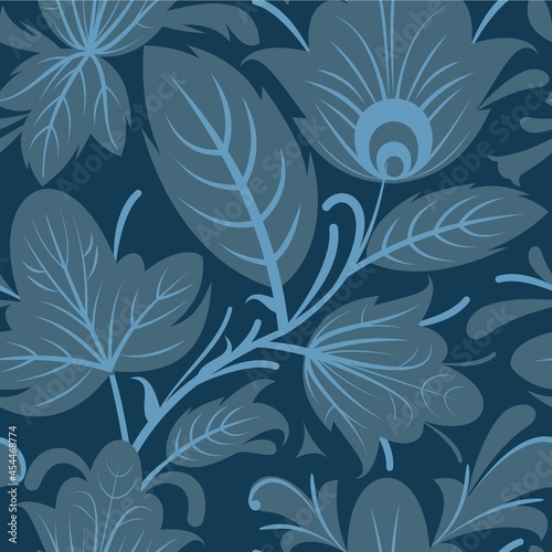 Dark vegetable seamless pattern. Cool cute ornament. Interlacing of branches and flowers. Background illustration. Flatly symbolic style. Vector