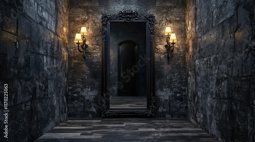Dark Vintage Room with Ornate Mirror and Wall Sconces