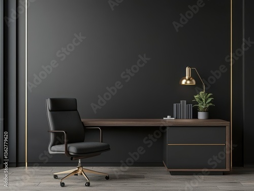 Dark walnut study room with golden accent lighting, sleek minimalist elegance