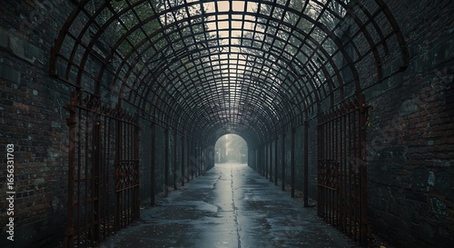 Dark, Wet Tunnel with Arched Metal Structure and Brick Walls