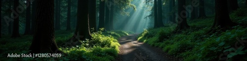 Dark, winding path through dense evergreen forest, shadows deep, solitude, path