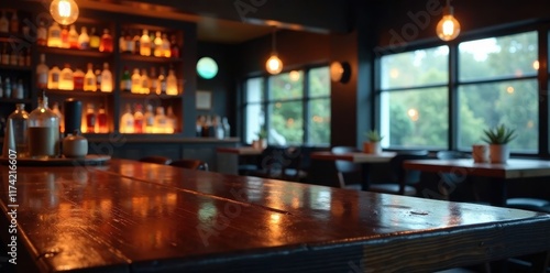 Dark wood counter with glass surface in bar setting, glass, ambient lighting