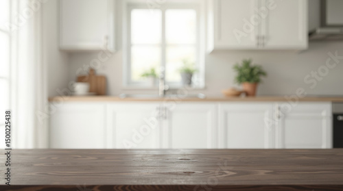 Dark Wooden Table Close-Up with a blurred modern white kitchen in the background, Shallow Focus