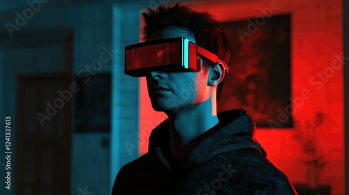 Dark-haired European man wearing 3D virtual reality glasses in a digitally enhanced environment showcasing modern technology with blue and red lighting.