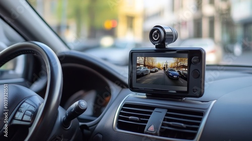 Dashboard camera recording a busy street scene in daylight from a parked car