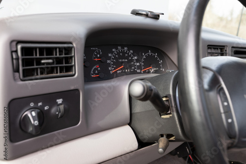 Dashboard cluster with analog gauges in a 2000s American pickup truck, showing speedometer, RPM, temperature, and fuel levels with steering wheel partially visible.