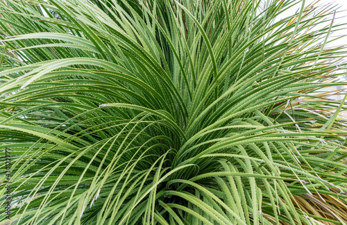 Dasylirion Graminifolium long leaves with toothed edges close up. Tropical beautiful plant grows in Arboretum Park Southern Cultures in Sirius (Adler) Sochi. Beautiful green natural background.