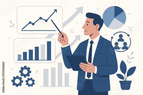 Data analysis concept with businessman presenting a financial report. Professional manager using a tablet for statistics, showing growth charts, productivity and successful business strategy.