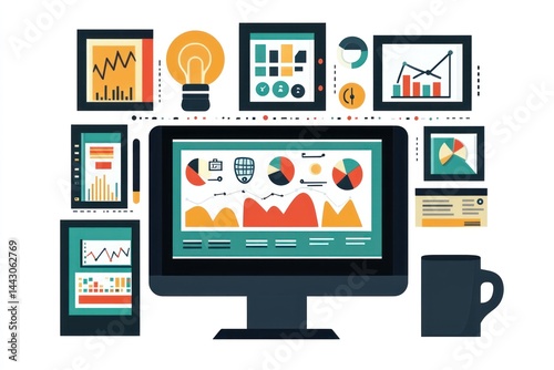 Data analysis on computer screen surrounded by charts, graphs, and devices.