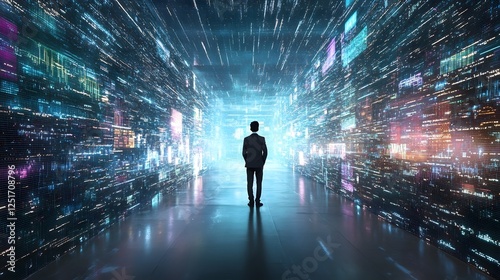 Data Analyst Examines Futuristic Digital Data Visualization in Immersive Sci Fi Environment