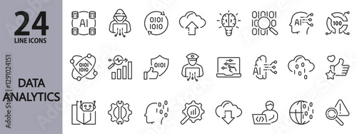 Data Analytics line icons set with Data, Analysis, Security, Cybersecurity, Database, Chart, Network and more. Editable Stroke