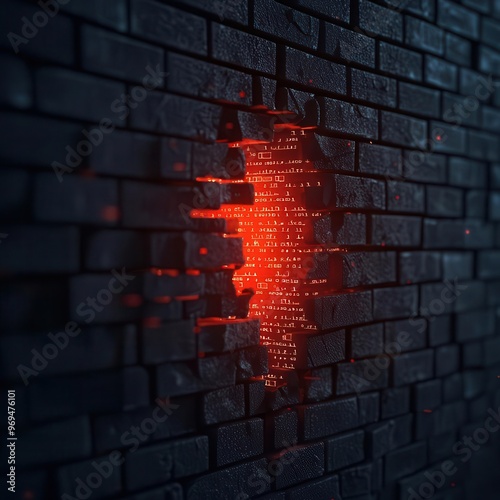 Data breach scene with code fragments floating around a cracked firewall, red alert lights, cybersecurity, data breach