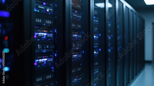 Data Center Server Racks with LED Lights and Cables, Reflective Floor and High-Performance Technology, Cloud Computing Concept