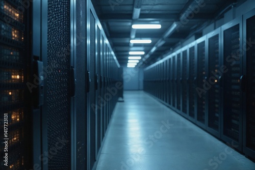 Data Center with Black Server Racks and Blinking LEDs