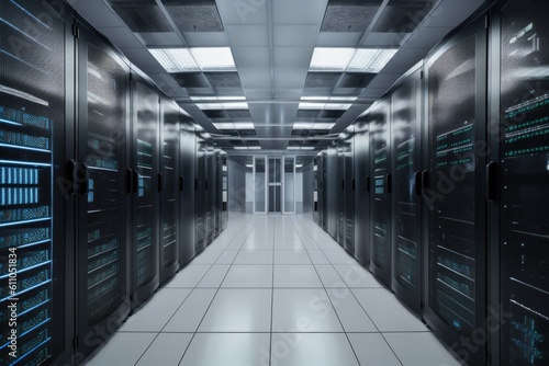 data center with rows of servers, each in its own cabinet, created with generative ai