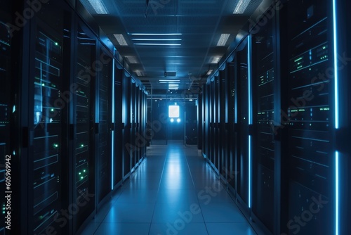 data center with rows of servers, each one with blinking led lights, created with generative ai