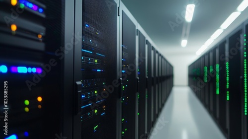 Data center with rows of servers, illuminated with colorful lights, modern infrastructure.