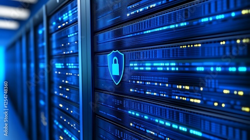 Data Center with Server Racks and Shield Icon Symbolizing Security and Protection in Technology Infrastructure