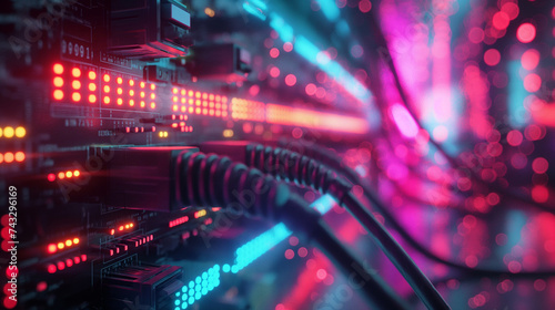 Data flowing through fiber optics cables, digital neon background, Generative AI