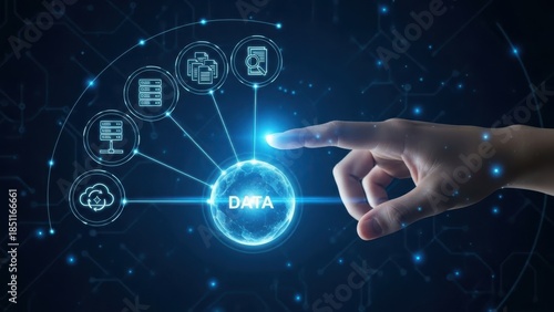 Data Management Solutions: Finger touching glowing earth globe with connected server and document icons for global information processing