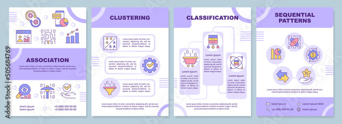 Data mining techniques purple brochure template. Machine learning. Leaflet design with linear icons. 4 vector layouts for presentation, annual reports. Arial-Black, Myriad Pro-Regular fonts used