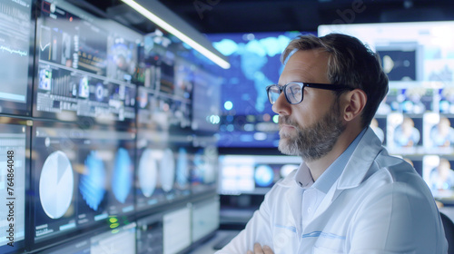 Data Monitoring Control Room. A professional in a control room monitors real-time data visualizations displayed on multiple screens.