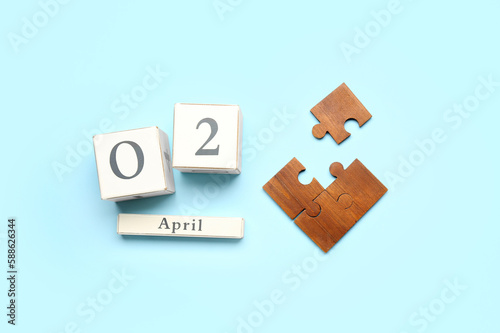 Date of World Autism Awareness Day and puzzle pieces on blue background