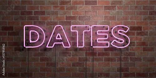 DATES - fluorescent Neon tube Sign on brickwork - Front view - 3D rendered royalty free stock picture. Can be used for online banner ads and direct mailers..