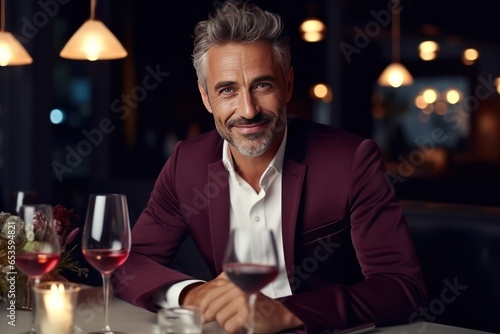 Dating. Middle aged Caucasian man on date in an expensive restaurant. He holds a glass of wine, smiling and looking at you. A romantic moment at a restaurant.