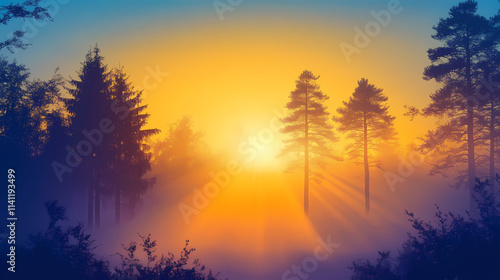 Dawn forest at dawn when the first rays. Dawn. Illustration