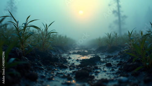 Dawn mist over glistening wet peat soil creating magical morning atmosphere with depth and mystery.