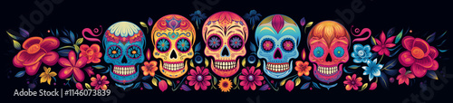 Day of the Dead, sugar skulls with colorful designs, floral patterns, and festive decorations celebrate Mexican tradition.