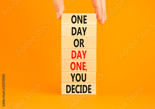 Day one symbol. Concept words One day or day one you decide on wooden blocks on a beautiful orange table orange background. Businessman hand. Business motivational and day one concept.